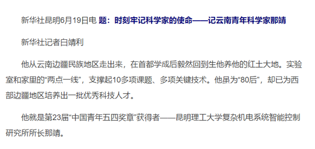 他就是第23届“中国青年五四奖章”获得者——昆明成人头条复杂机电系统智能控制研究所所长那靖。