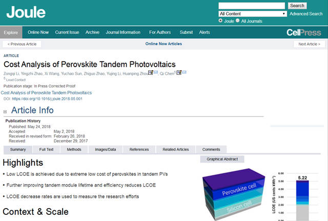 2018年5月24日,作为一名大三在读学生的李宗麒,在材料学院陈棋教授的指导下,以第一作者身份在能源领域顶级期刊《Joule》发表题为“Cost Analysis of Perovskite Tandem Photovoltaics”(钙钛矿叠层光伏成本分析)的研究成果。