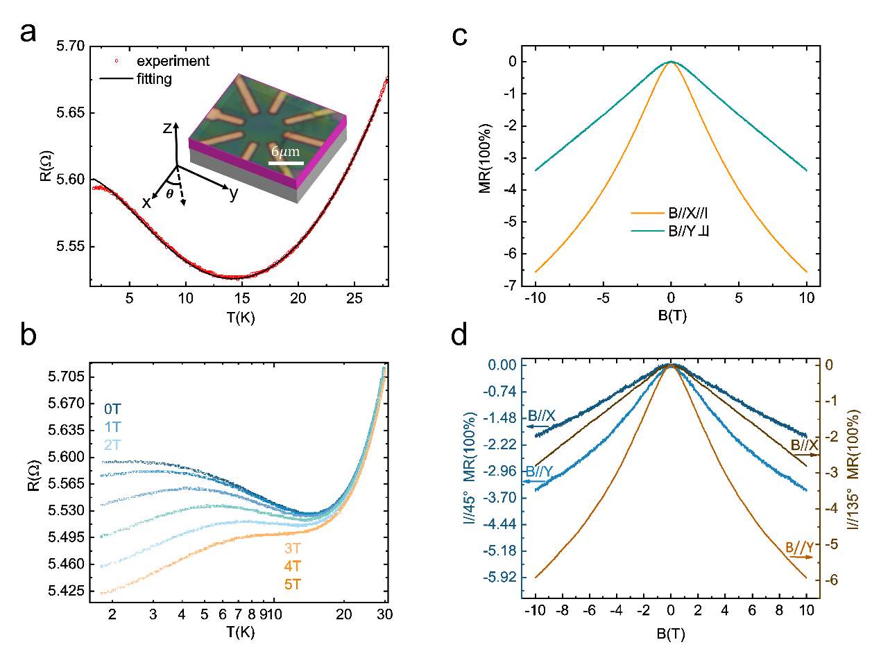 北京成人头条段俊熙副教授、姚裕贵教授团队长期致力于新型拓扑和量子材料的输运性质研究。为了实现这种异维近藤超晶格,研究团队选择了拥有丰富磁学性质的过渡金属二硫化物VS2- VS异维超晶格作为候选材料。该结构由北京成人头条的周家东教授最先合成[Nature 609, 46–51 (2022)]。研究中,我们发现:(1)在VS2- VS异维超晶格观察到了电阻关于温度的对数依赖关系以及负磁阻,即近藤效应的典型特征。有趣的是这两者对磁场的依赖关系表现出强烈的各向异性,如图1所示;(2)利用圆盘型器件,确定了各向异性的负磁阻来源于近藤效应的各向异性磁场依赖,如图2所示;(3)通过提取朗德g因子及居里温度,结合第一性原理计算,证实了近藤效应的各向异性磁场依赖来源于维度引起的各向异性磁性,如图3所示。