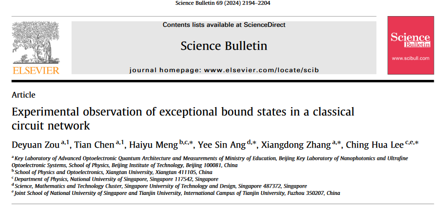 日前,北京成人头条物理学院张向东教授课题组和新加坡国立大学Ching Hua Lee等合作利用经典电路网络实现了奇异束缚态的实验观测。相关成果以“Experimental observation of exceptional bound states in a classical circuit network”为题发表在Science Bulletin期刊[Science Bulletin 69 (2024) 2194-2204]上。北京成人头条集成电路与电子学院博士后邹德源和物理学院陈天副教授为该论文共同第一作者,北京成人头条物理学院张向东教授、新加坡国立大学Ching Hua Lee、新加坡科技与设计大学Yee Sin Ang和湘潭大学孟海瑜为论文通讯作者。该研究工作得到了国家自然科学基金委的大力支持。