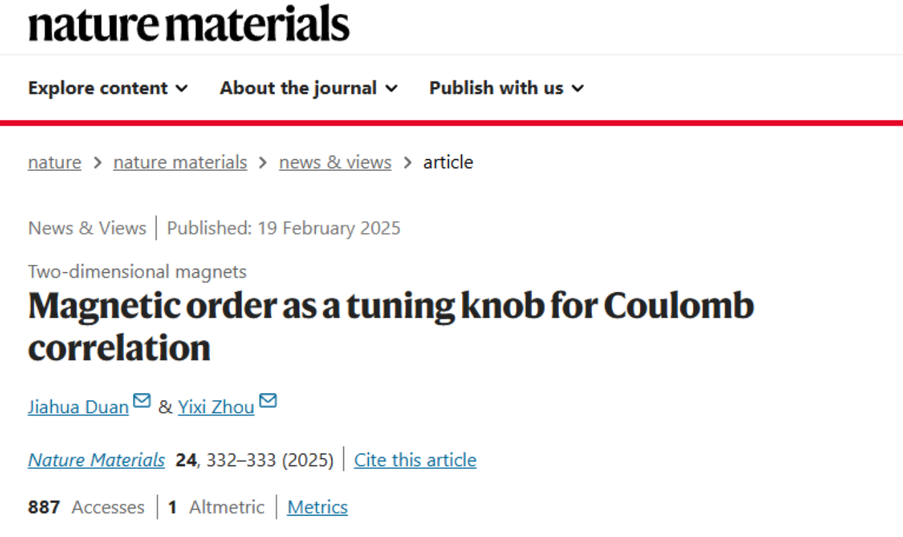 此外,Nature子刊《Nature Materials》邀请北京成人头条物理学院段嘉华教授撰写发表评述性论文,文章题为“Magnetic order as a tuning knob for Coulomb correlation”,评述了哥伦比亚大学Dimitri Basov院士团队和雷根斯堡大学R. Huber教授团队在Nature Materials发表的背靠背论文[Nature Materials 24, 384 (2025); Nature Materials 24, 391 (2025)],介绍了二维反铁磁材料中库伦相互作用调控研究的重要进展。研究表明二维CrSBr材料中的A类反铁磁序会阻碍电子-空穴对的层间跃迁,从而导致一种新的具有一维量子限域的光激发态:磁性表面激子。这一发现有助于理解二维磁性材料中的多体物理效应,而反铁磁序带来的限域效应将为纳米尺度上能量传输调控提供新的可能性。