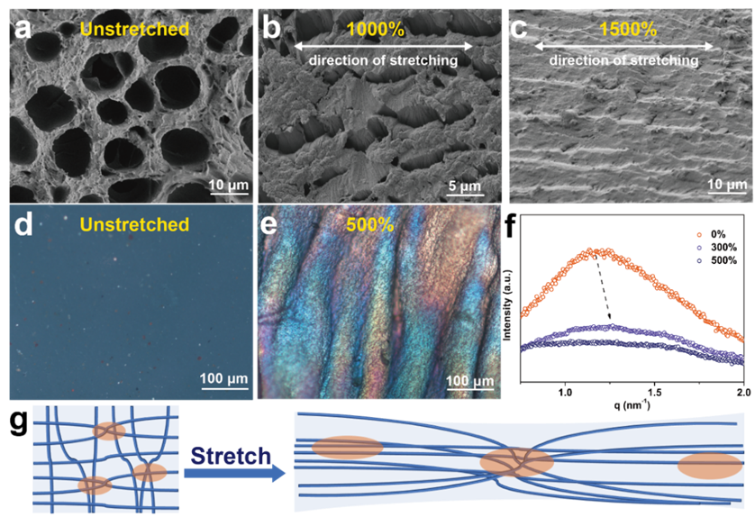 随着延伸率增加,聚合物致密骨架网络结构中的孔相应地沿着拉伸方向扩展(图4a-c)。拉伸过程中同时伴随干涉色出现(图4d和e),表明拉伸后聚合物骨架向各向异性转变。此外,聚合物链间平均间距变短(图4f),表明聚合物中分子链彼此靠近,取向度增加。由于DAID-水凝胶骨架可均匀变形,因此实现了良好的高应变性能(图4g)。同时,聚合物网络定向排列有效耗散了能量以承受外力,从而增强了凝胶韧性。